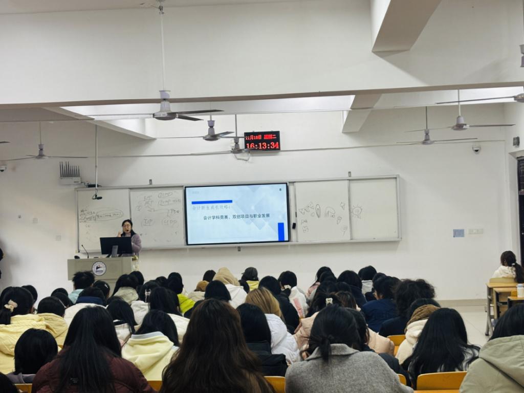 (财会金融学院 黄薇)2025年11月18日,财会金融学院在科创楼A103教室举办了一场以“会计学科竞赛、双创项目与职业发展”为主题的专题讲座,财税教研室老师汪柳主讲,旨在让学生全面了解会计学科竞赛及创新创业项目比赛,助力学生提升专业素养与实践能力,为未来职业生涯奠定坚实基础。注会2501、注会2502、新道2501班参加了本次讲座。