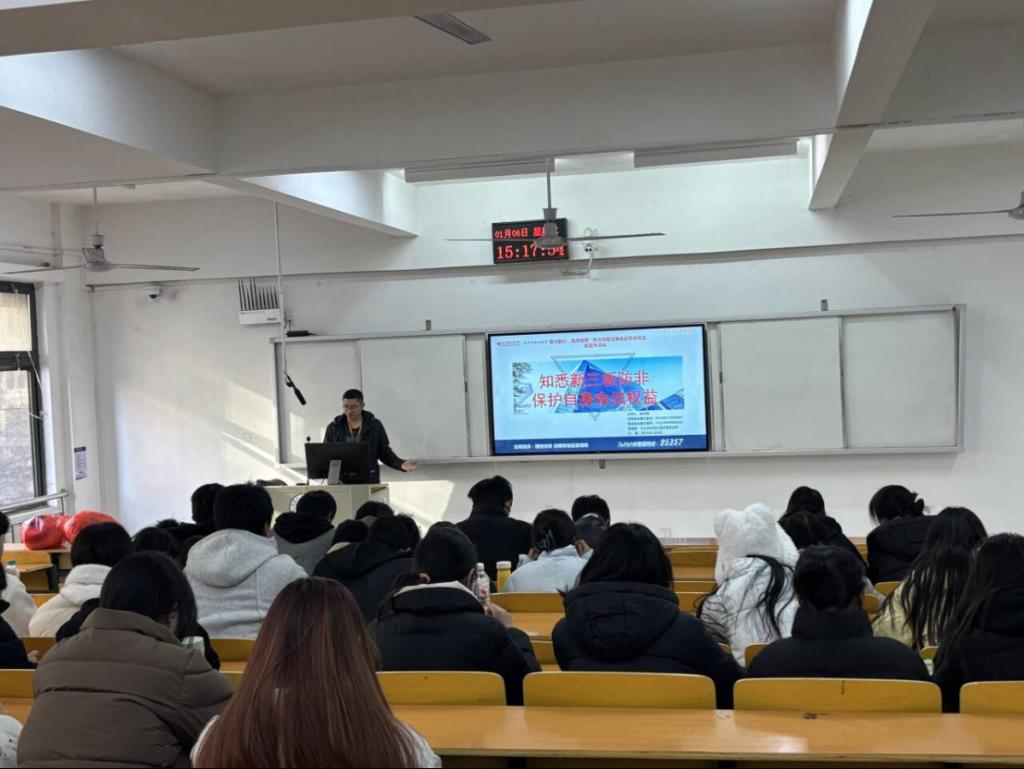 (财会金融学院 黄薇)为助力学生全面了解新三板市场,提升风险识别与防范能力,1月6日下午,财会金融学院联合东方财富证券九江长虹西大道证券营业部,在科创楼103教室举办了“知悉新三板防非,守护校园投资安全”专题投资者教育活动。金融2503班全体同学参加了本次讲座。