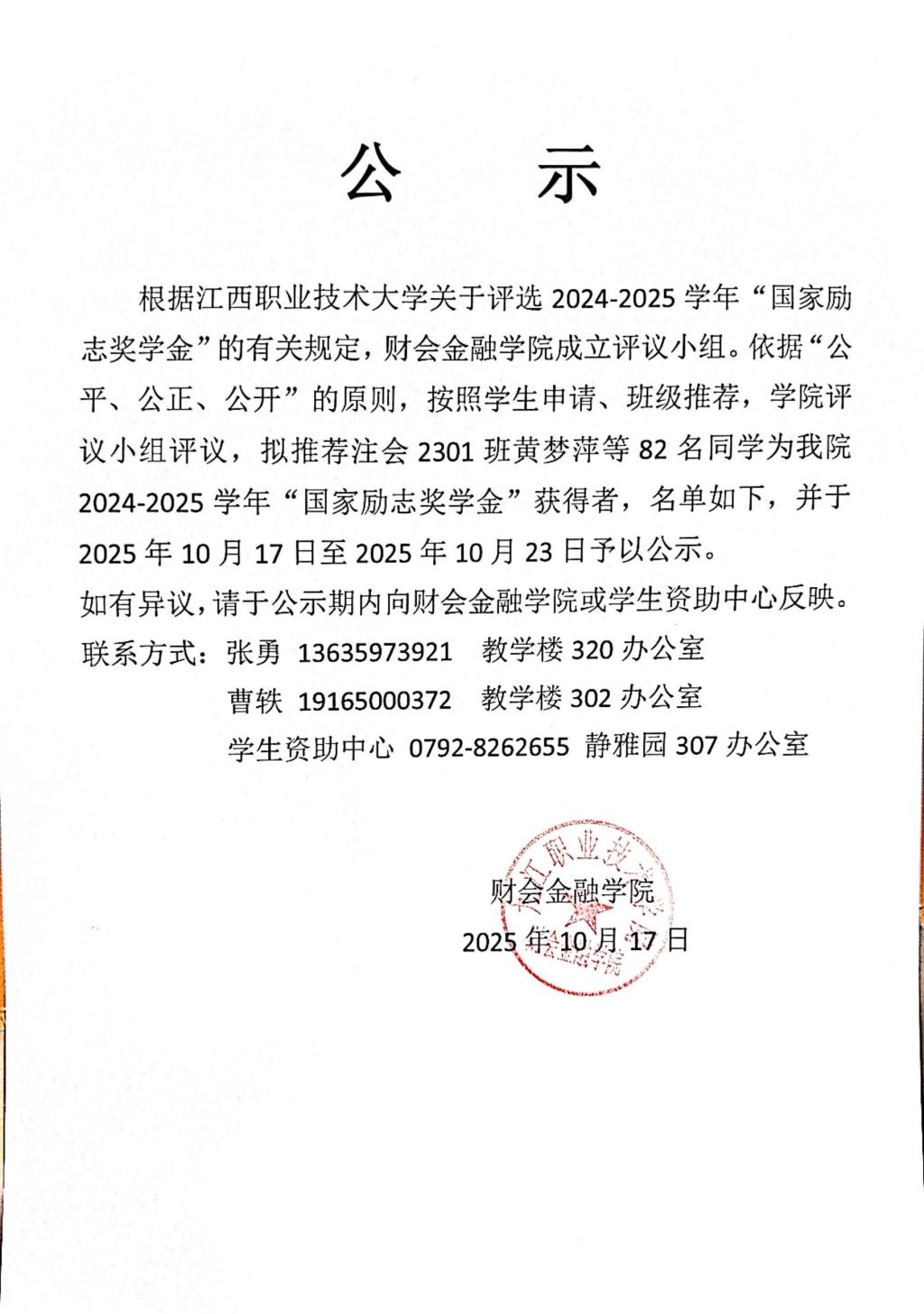 财会金融学院2024—2025学年国家励志奖学金获奖学生名单公示