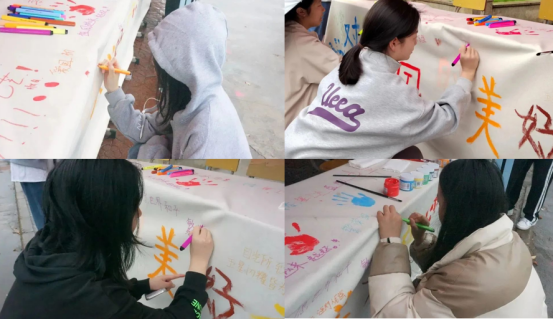活动现场气氛热烈,工作人员精心设置了“表白墙”,鼓励同学们在画布上留下对祖国的深情祝福和美好愿望。同学们积极地在画布上写下自己对祖国的美好祝愿,并印上手印,以此表达对祖国的热爱与敬仰。这些色彩斑斓、情感真挚的祝福成为了校园内一道亮丽的风景线,彰显着青年学子对祖国的深厚感情。